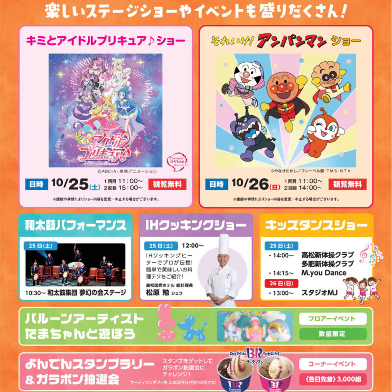 大人から子供まで楽しめる、アンパンマンやプリキュアショー、
