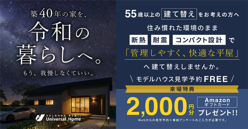建て替え?住み替え?あなたはどっち? 2026.05.01 建て替え?住み替え?あなたはどっち? 畑のある暮らしや愛犬がいる暮らしなど、 子育てが落ち着いて、ゆっくり過ごせる理想の暮らしを考えてみませんか? 55歳から考える大人の棲家 高松東店・丸亀店・建売住宅のご来場予約は下記からどうぞ 各種イベントも実施中です(*^▽^*) 一覧へ戻る 新着お知らせ 建て替え?住み替え?あなたはどっち? 2026.05.01 おうちの定期便 ~55歳から考える大人の棲家~ 2026.04.30 【2026年4月現在】累計1171棟お引渡し致しました! 2026.04.29 ~ゴールデンウィーク定休日のお知らせ~ 2026.04.18 ~4月定休日とイベントのお知らせ~ 2026.04.04 新着イベント・キャンペーン5/2・3・4『こどもの日新規ご来場特典』&5/10『ちびっこ大工上棟体験』2026.04.26第4回『おむつ詰め放題』5月毎週土日開催2026.04.26小さな手が造った贈り物【母の日イベント】5/9・10限定2026.04.17